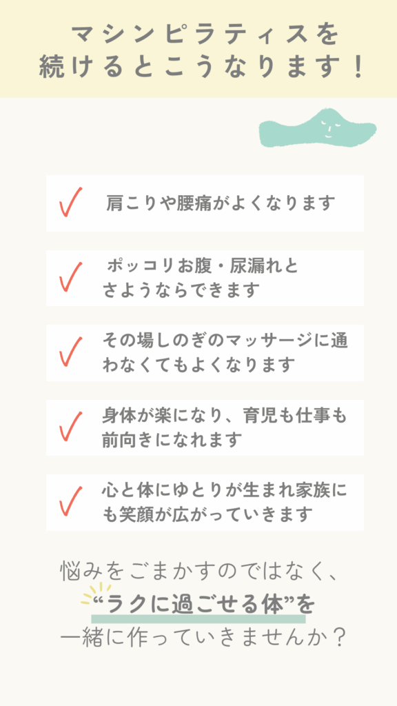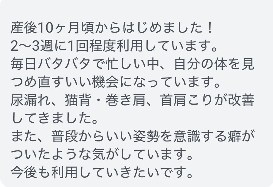 - 産後、肩こり・腰痛・骨盤のぐらつきなどがずっと続いている