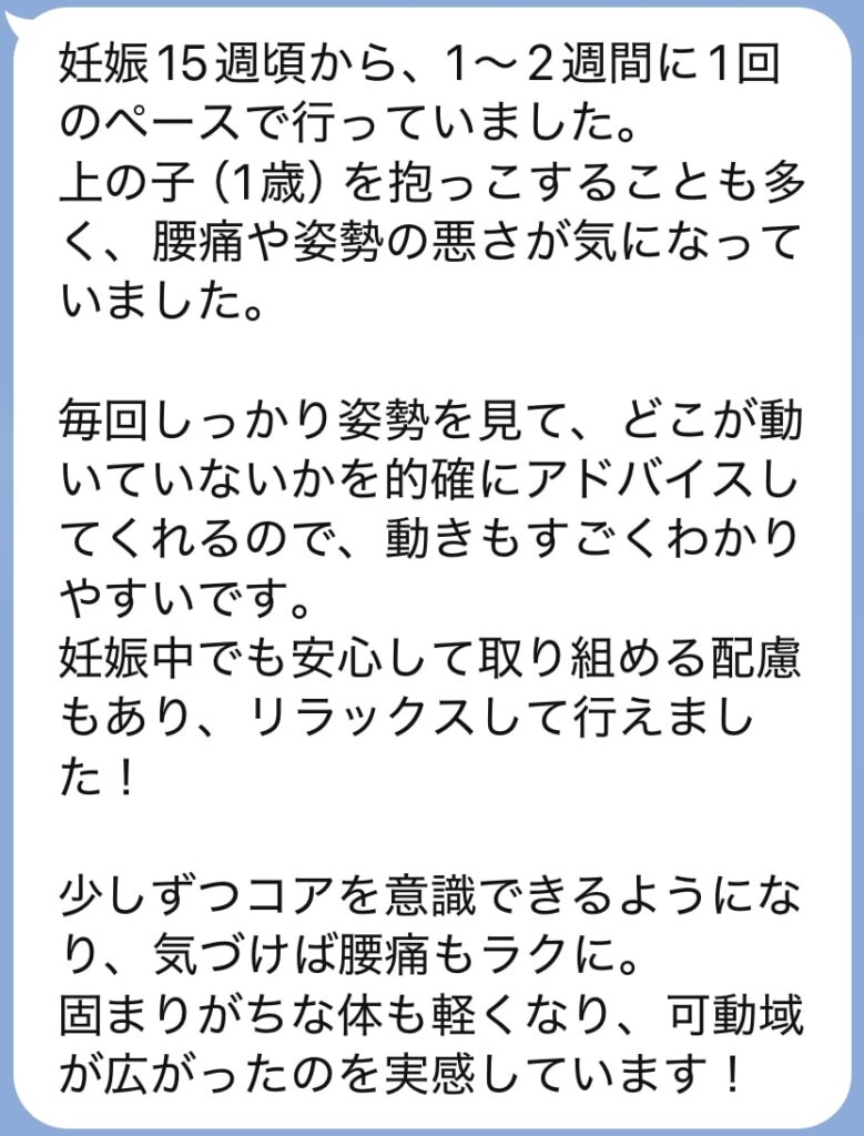 妊娠期に合わせて、とれるポーズで体をほぐしたり、弱くなる骨盤底筋を入れることができたり、立ち姿勢を修正できたり、などなど。