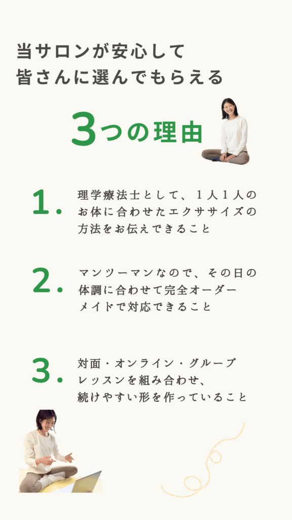 次の出産に備えて身体を整えたいと思っているのと、慢性的な肩こりや首凝りも改善できると知れたこと、趣味の楽器演奏でより良い演奏ができるようになると思ったことが理由です。
